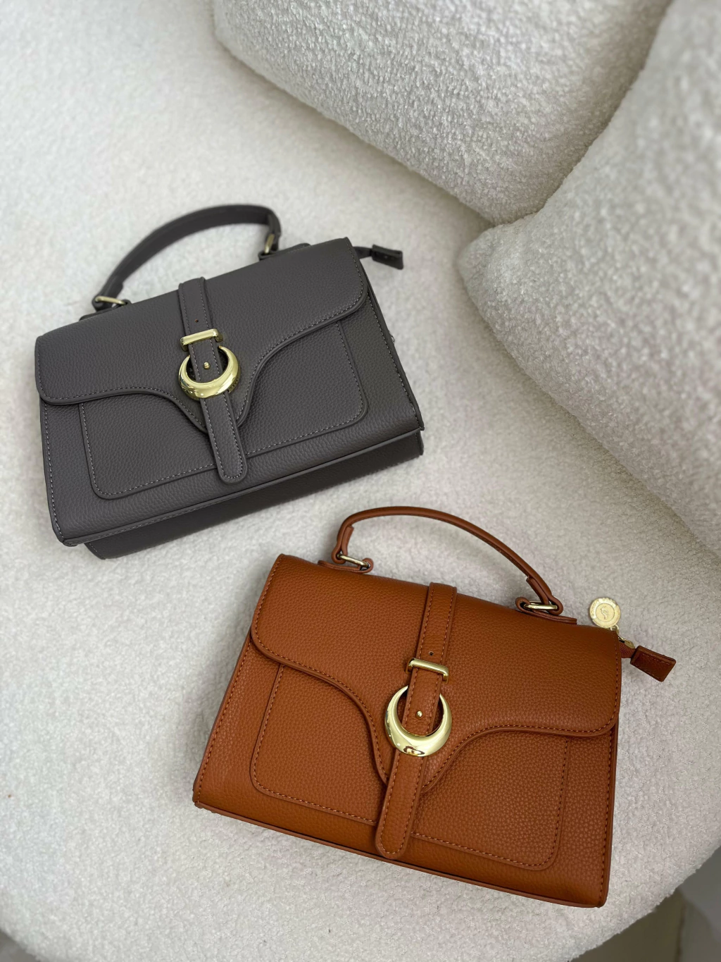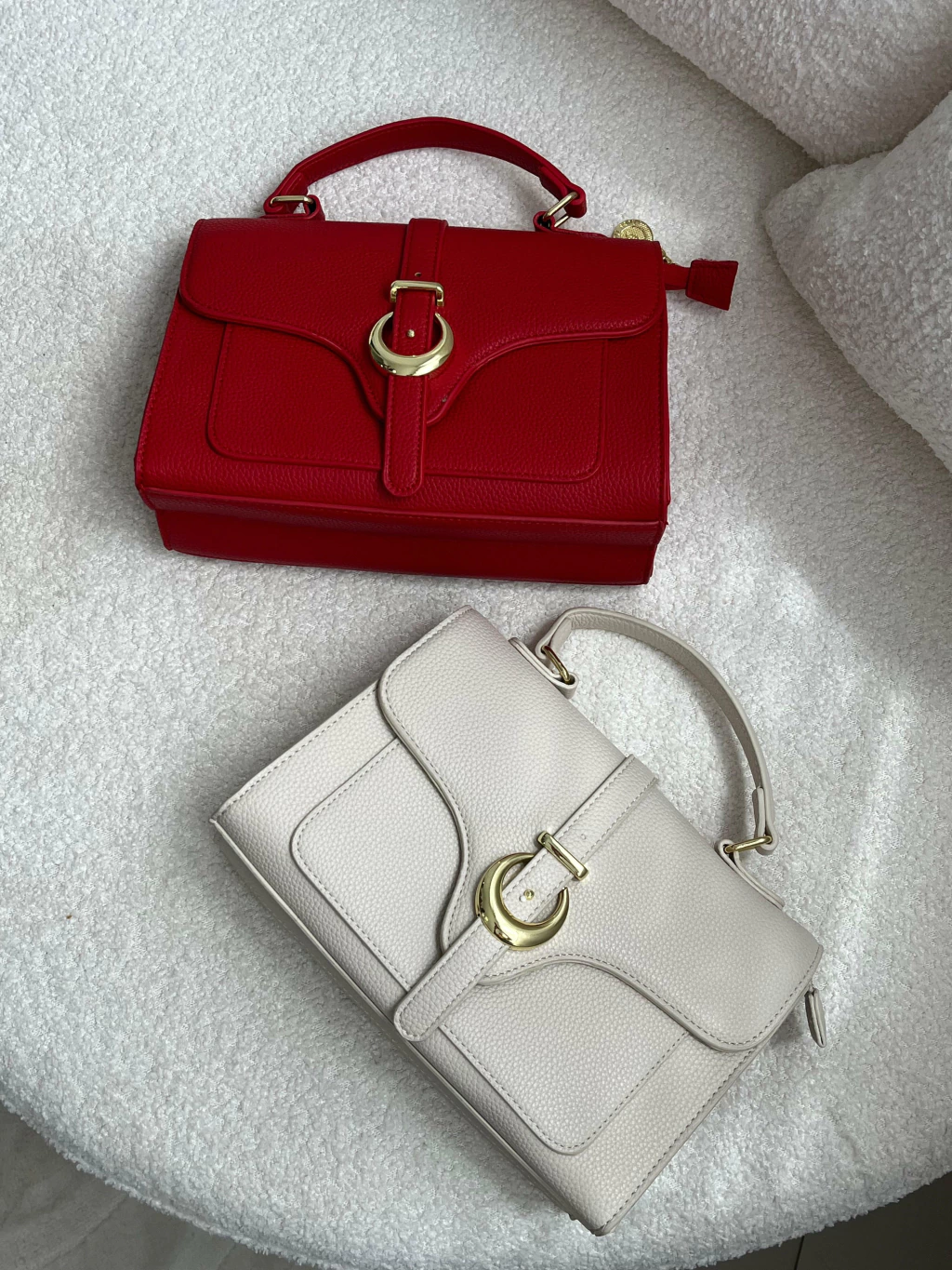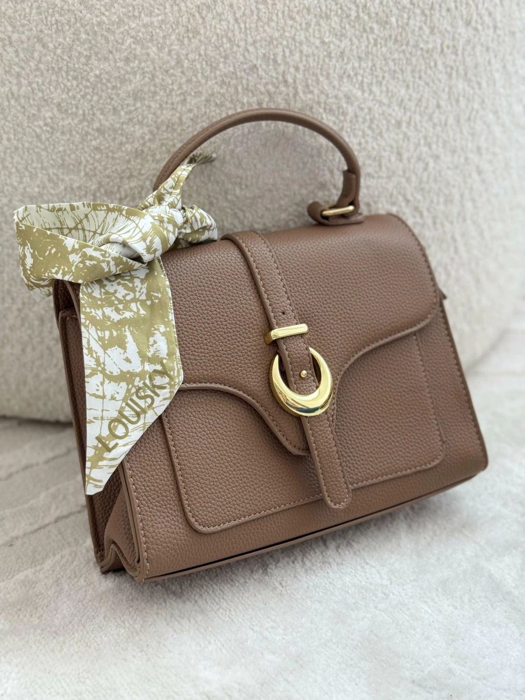 Design e Estilo: Com acabamento em couro texturizado, essa bolsa apresenta um design elegante e moderno, complementado por um fecho dourado em formato de meia-lua, que adiciona um toque de luxo. O detalhe em lenço, amarrado com delicadeza, traz um elemento de frescor e personalidade à peça.