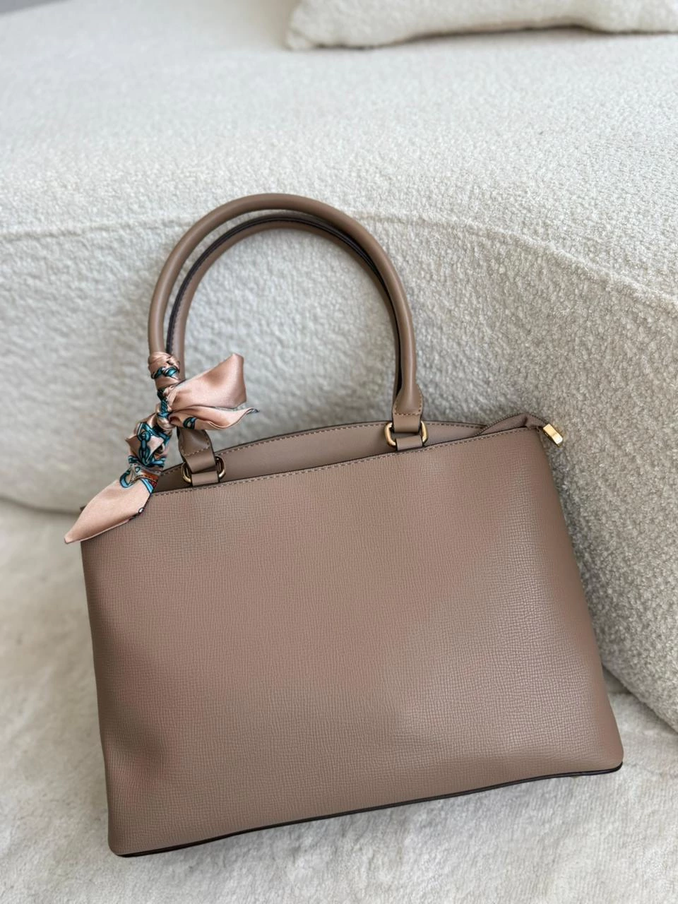 Possui alças firmes com acabamento reforçado, além de um lenço decorativo que traz um toque moderno e exclusivo à peça.