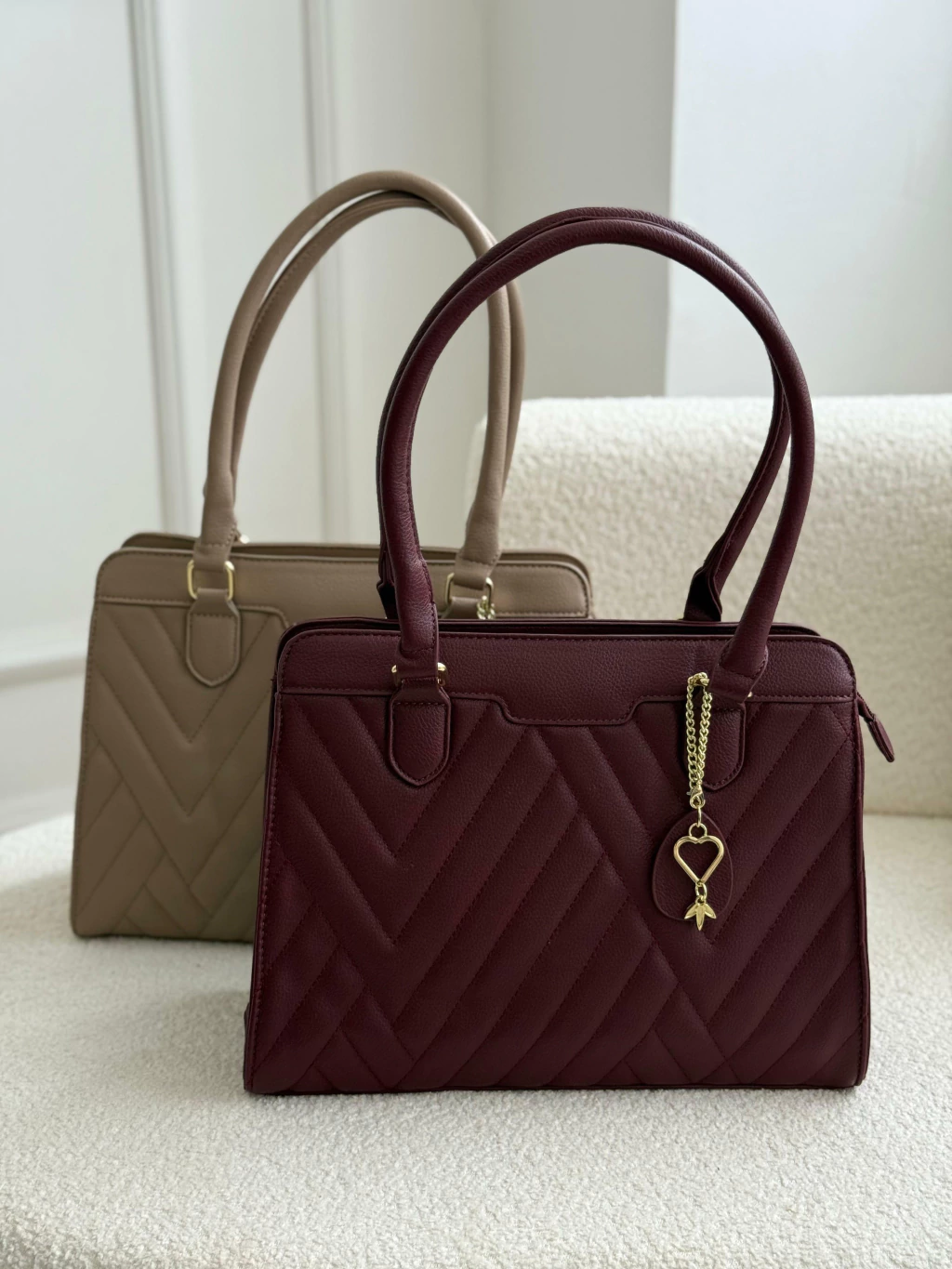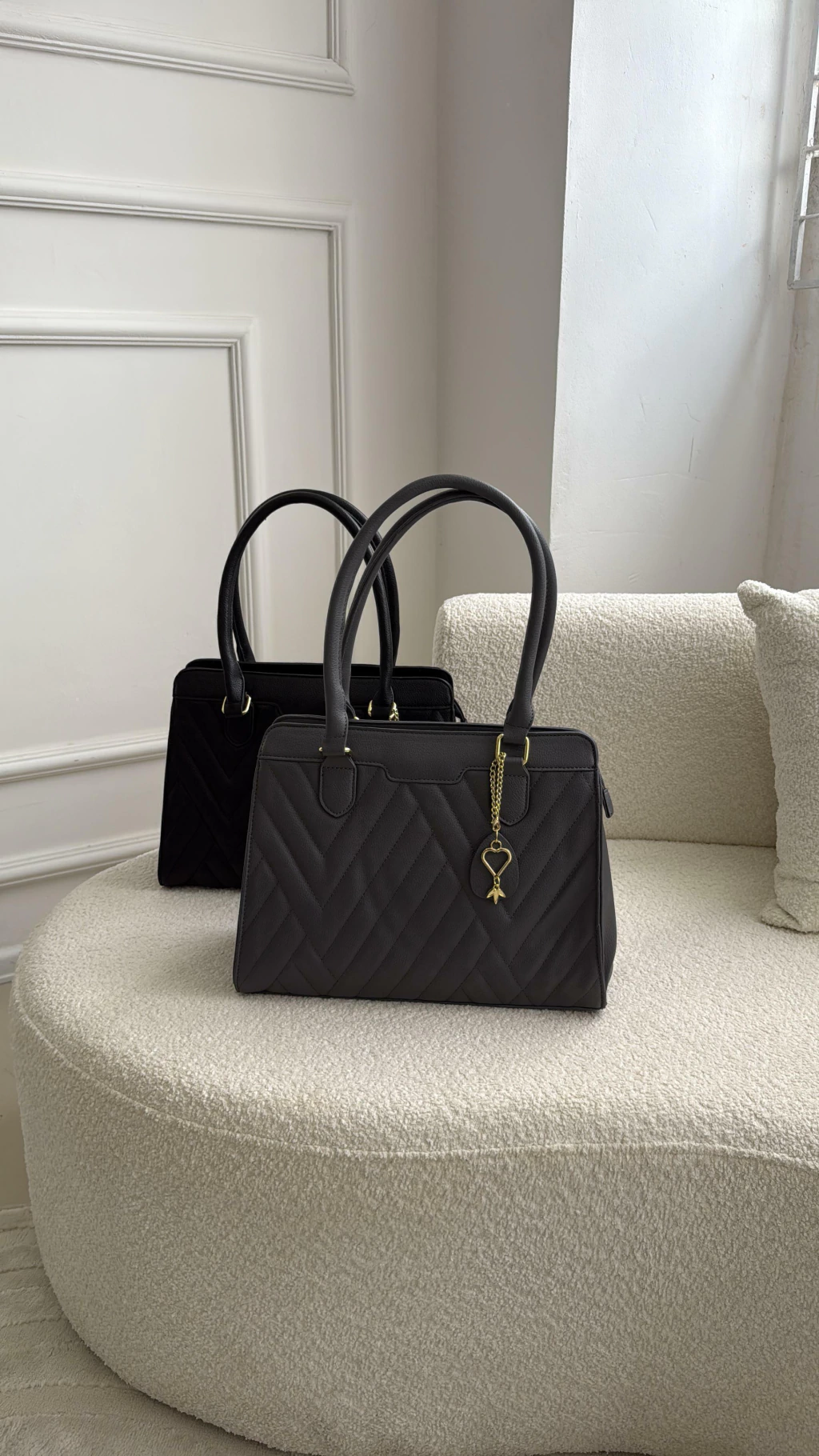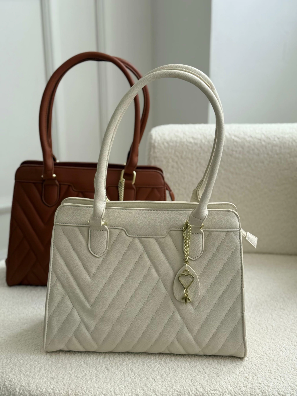 Essa bolsa tote é confeccionada em material texturizado com costura matelassê em padrão chevron, trazendo elegância atemporal para qualquer look.