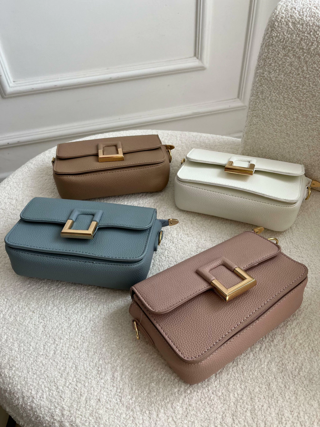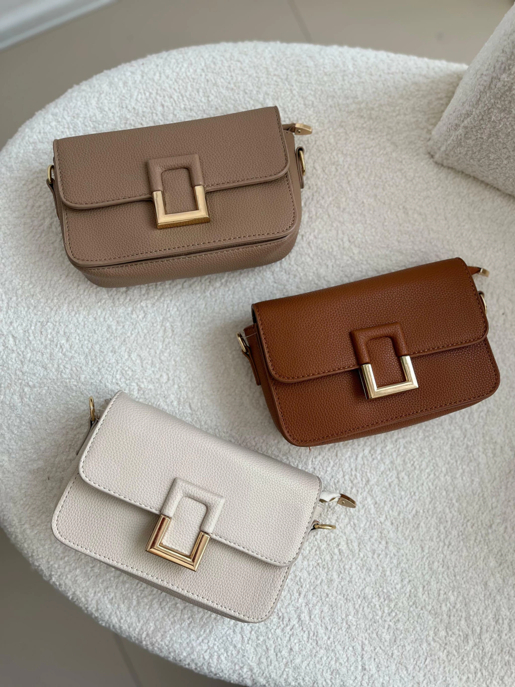 Confeccionada em material texturizado, possui design estruturado com fechamento em aba e detalhe de fivela quadrada dourada que dá um toque sofisticado à peça.