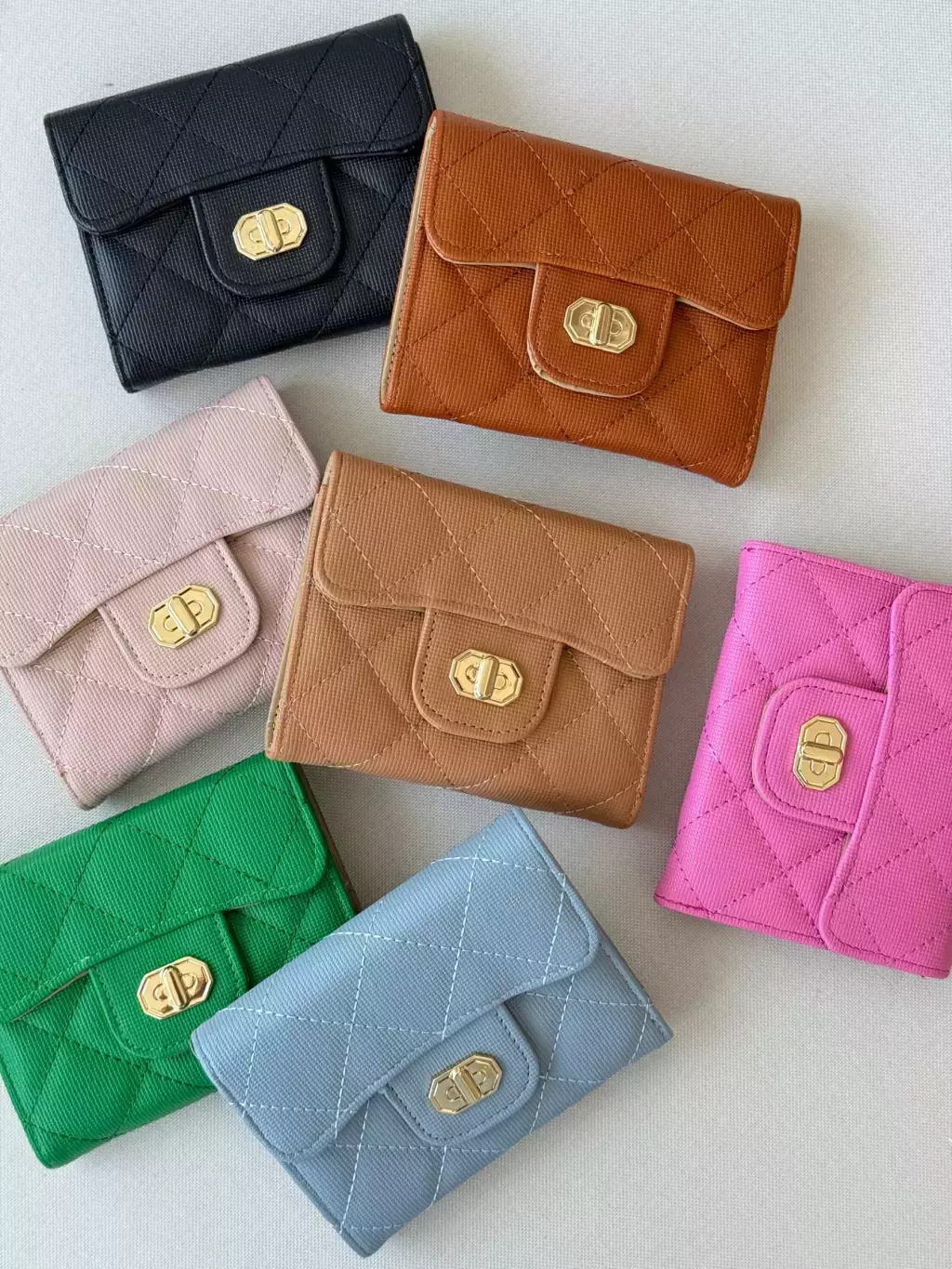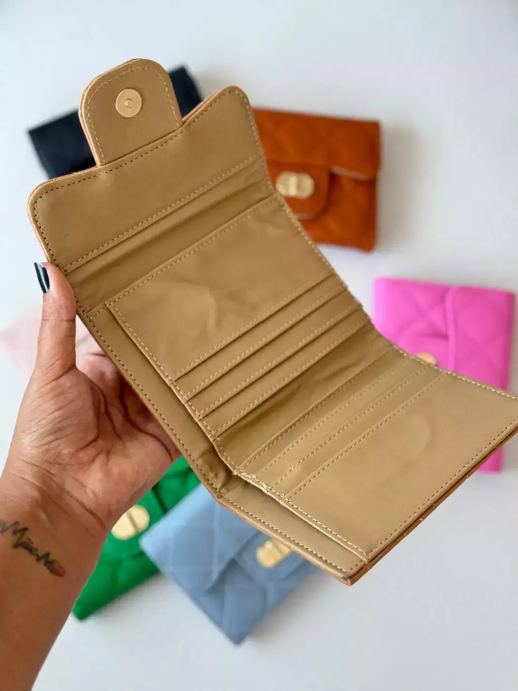 Disponível nas cores preta, off white, rosa, caqui, violeta, verde e pink, essa carteira é como um arco-íris em miniatura! Escolha a sua favorita e prepare-se para arrasar em qualquer ocasião.