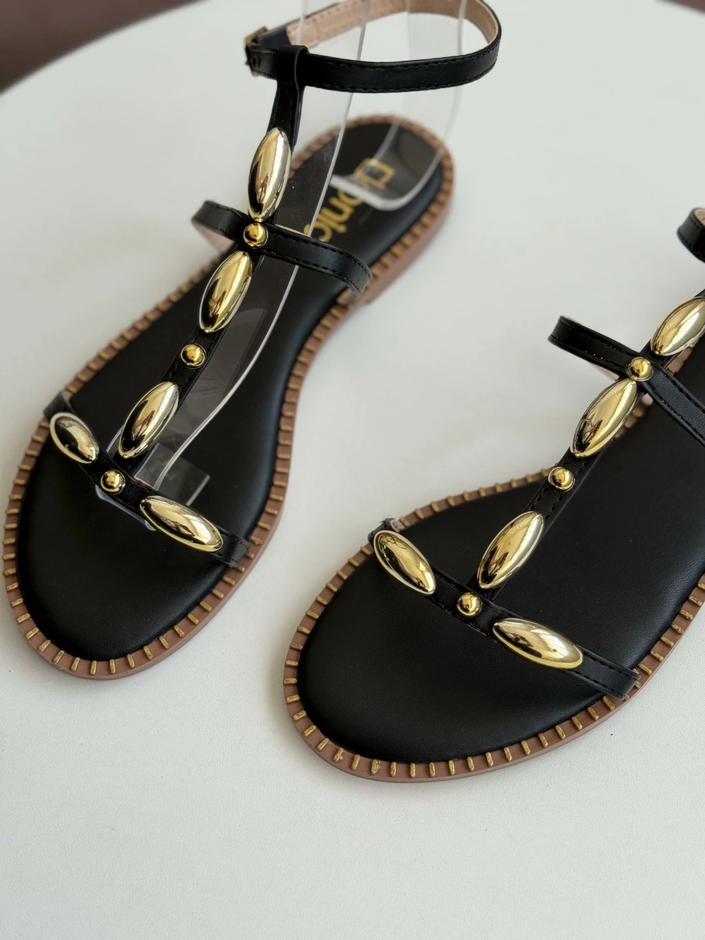 Com design elegante e tropical, ela traz tiras finas com fechamento no tornozelo e aplicação de búzios metálicos dourados, que adicionam um toque sofisticado e praiano ao look.