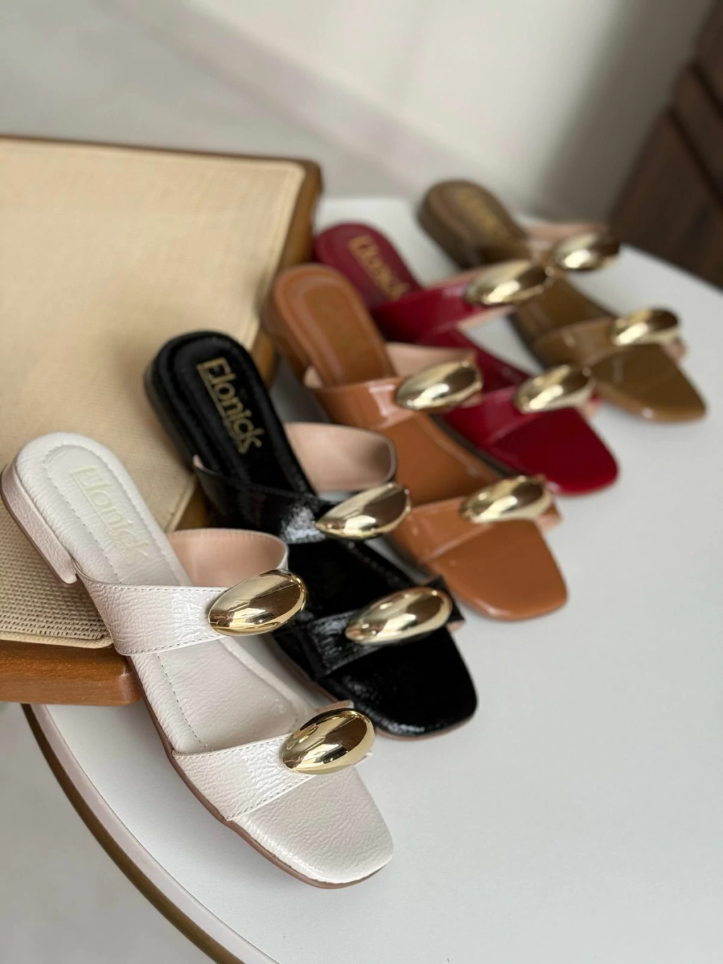Estilo e sofisticação em cada passo! Essa rasteira da Elanick une conforto e elegância com um design moderno que destaca o detalhe oval dourado nas tiras.